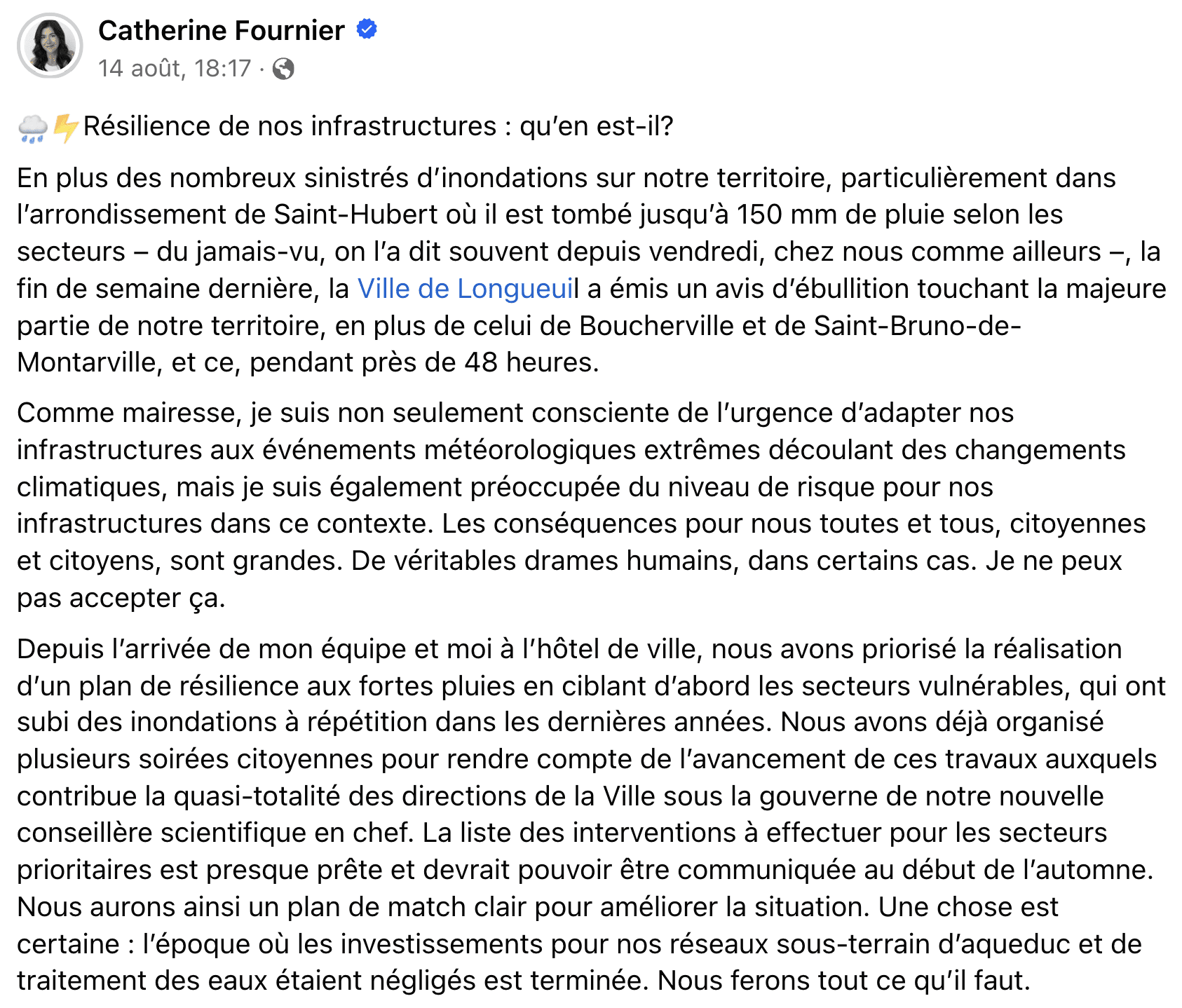 À Longueuil, on maintient qu’on a compris qu’il était temps de sortir des vieilles habitudes. Avec une conseillère scientifique en chef comme Julie-Maude Normandin, nommée en 2023, la ville a fait de la lutte contre les inondations pluviales une priorité. Ce n’est pas encore la panacée, mais la volonté d’agir en amont est bel et bien là.