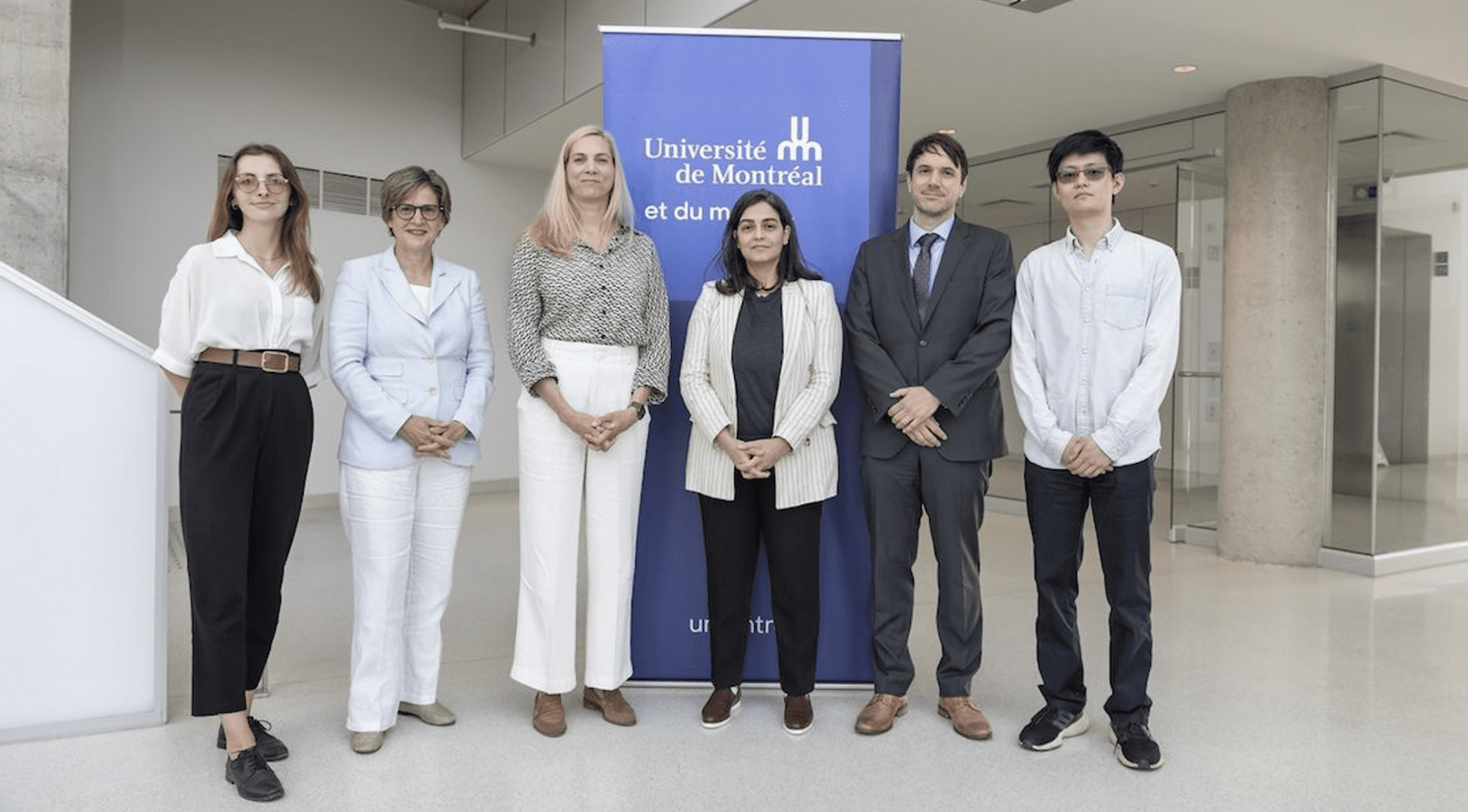 De gauche à droite: Camille Thibault, étudiante à la maîtrise en science politique à l’UdeM et membre de Mila, Marie-Josée Hébert, Pascale St-Onge, Reihaneh Rabbany, Jean-François Godbout, Zachary Yang, étudiant au doctorat en informatique à McGill et membre de Mila. (Crédit photo : Amélie Philibert, Université de Montréal)