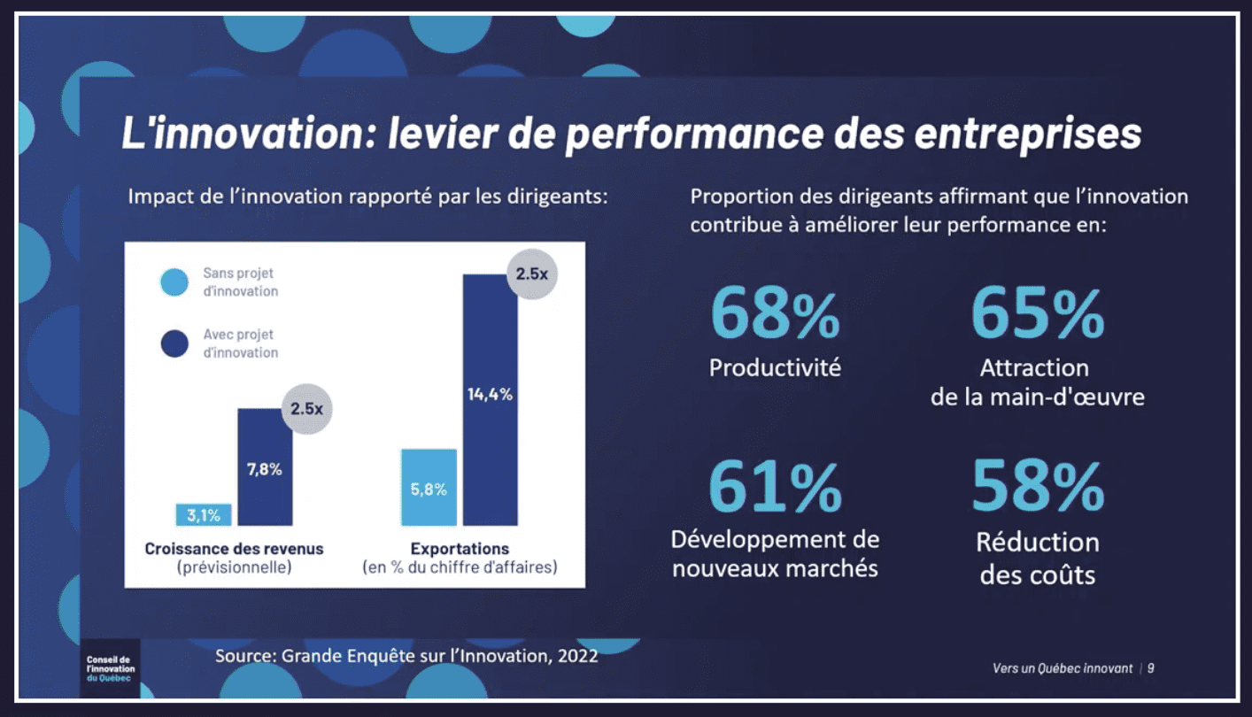 Il existe déjà des moyens pour stimuler l’innovation au Québec, notamment par des prêts, des subventions et crédits d’impôt, ainsi que de l’aide indirecte aux entreprises offerte à travers des groupes d’experts et du partage d’information. Mais selon les résultats d’un sondage réalisé auprès de plus de 750 entreprises dans le cadre de ce rapport, ces moyens restent peu utilisés par les PME, que ce soit par manque de connaissances ou en raison de leur trop grande complexité.
